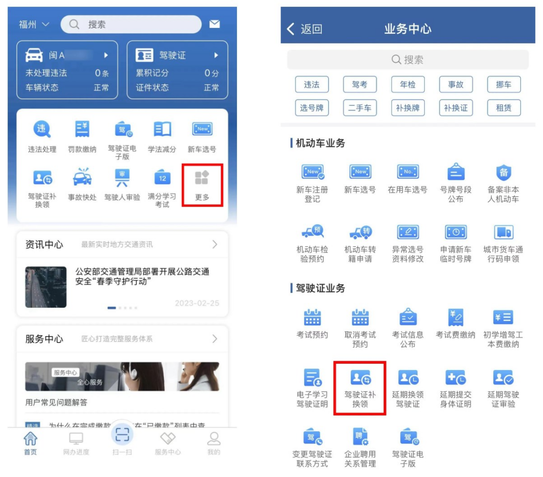 注册登录“交管12123”APP → 更多业务 → 业务中心 → 驾驶证业务 → 驾驶证补换领。