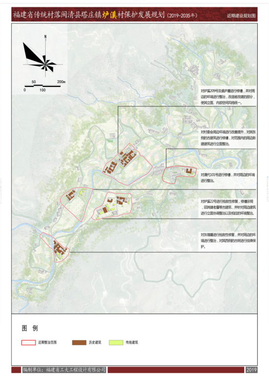 近期建设:炉溪村近期建设主要目的是提升村庄整体风貌。精心完成灰墙厝、炉溪22号、炉溪101号、炉溪209号、盛庐楼等6座古民居的修缮、维护工作;重点完成公共厕所、停车场、消火栓、垃圾桶等基础设施建设,改善村民居住环境,提升村庄整体景观风貌。