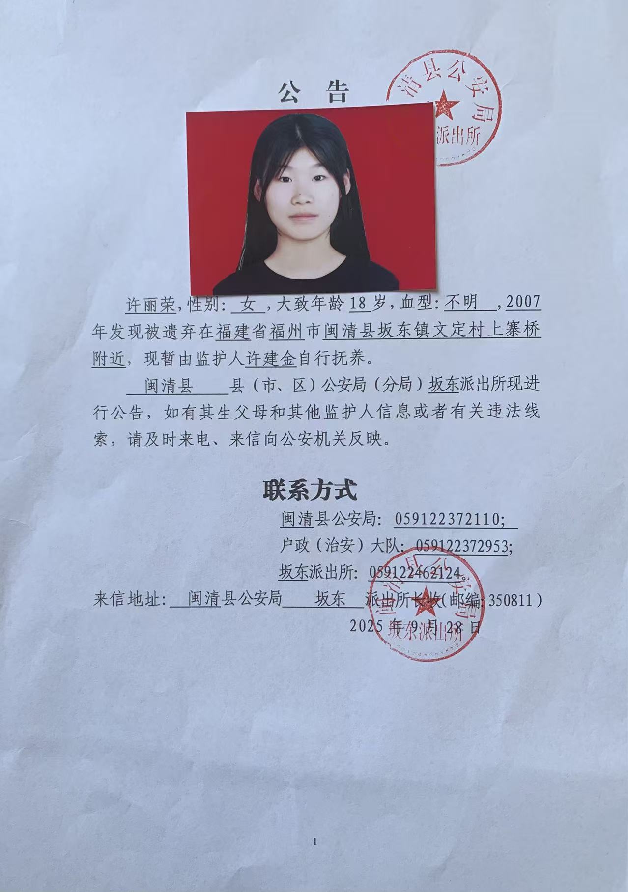 关于无户口人员许丽荣的寻求公告