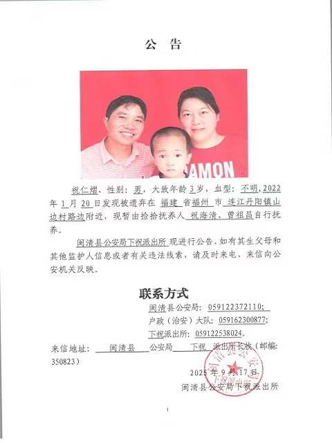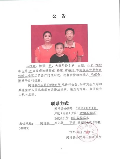 关于无户口人员马程熠、祝仁熠的寻亲公告