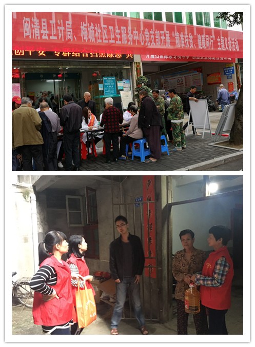在梅城社区卫生服务中心门口,闽清县卫计局与梅城社区卫生服务中心志愿者们正在认真为前来的群众量血压、检查病情、耐心解疑,为患者免费赠送药品、发送防病手册、宣讲家庭医生签约服务及健康扶贫相关政策等。梅城社区卫生服务中心组织党员志愿者服务队深入辖区建档立卡农村贫困户的家庭,为扶贫对象提供家庭医生签约服务,给他们测血压、检查身体,仔细询问患病贫困群众的病情,给予就医用药指导,并宣传健康扶贫政策,还向贫困户家庭送上食用油、牛奶等慰问品。接过黄銮英书记送来慰问品,“党和政府真是对我们太好了,感谢党和政府,感谢你们对我的关心和帮助。”蒋春娇说。