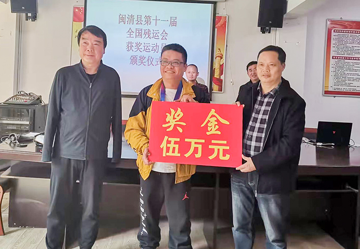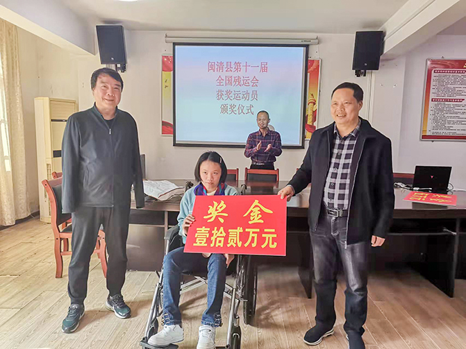 现场,县政府副县长王致镜为他们颁发了奖金。并鼓励他们继续发扬胜不骄、败不馁的精神,全心全意投入到未来的训练和竞赛中;把社会各界的关爱化作感恩之心,赛出风格,赛出水平,为闽清的残疾人事业增光添彩。