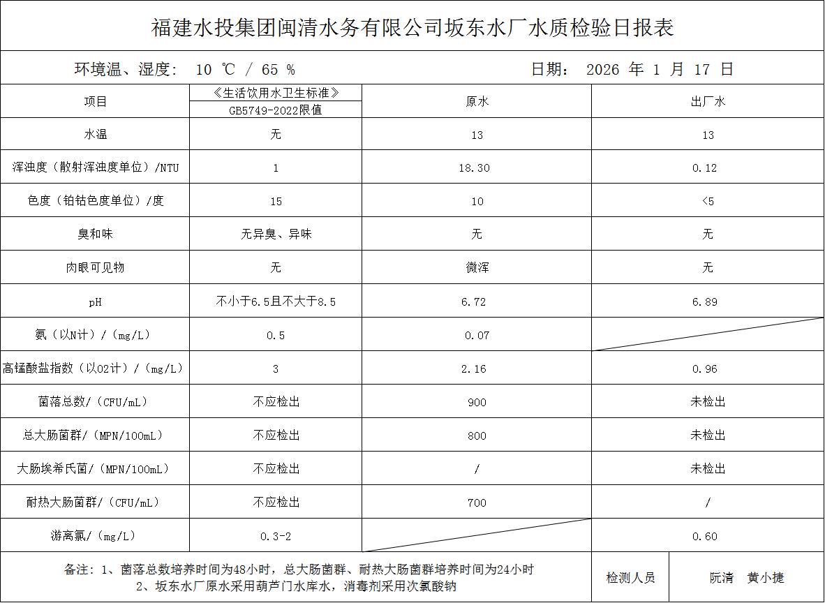 2026年1月17日闽清水务水质检测报告